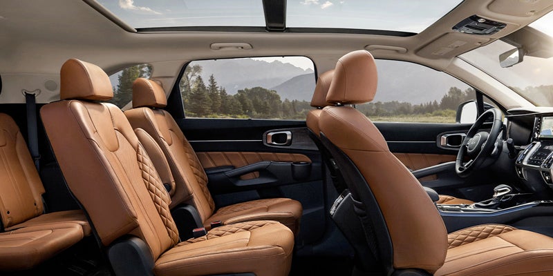 The inside of the Kia Sorento offers extensive luxury and comfort features with quilted leather seats and room for seven passengers. If you upgrade to second-row bucket seats, the passenger capacity is six. The cargo space is generous, with 38.5 cubic feet of space available with only the third row folded down, allowing you to bring both cargo and passengers on your adventure. The Sorento boasts top-of-the-line technology features, including Bluetooth and an available 12-speaker Bose stereo.