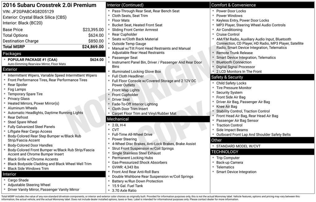 ***CALL 740-773-2153 FOR MOST ACCURATE INFORMATION***This 2016 Subaru Crosstrek 2.0i Premium is an exceptional value in the compact crossover segment. Featuring a bold, rugged exterior design and a spacious, well-appointed interior, this Crosstrek is primed to elevate your daily driving experience. Let's explore the key features that make this vehicle a standout choice.- Popular Package #1- Standard Model w/CVT- Subaru Starlink Smartphone Integration- Heated Front Bucket Seats- 17 x 7.0J Aluminum Alloy WheelsThe Crosstrek's 2.0L 16V DOHC Lineartronic CVT engine delivers an impressive balance of power and efficiency, with an EPA-estimated 26 city/34 highway MPG. Subaru's legendary Symmetrical All-Wheel Drive system provides confident, sure-footed traction in a variety of road conditions, making this Crosstrek a versatile companion for your adventures.Inside, the premium cloth upholstery and heated front seats ensure year-round comfort, while the Subaru Starlink infotainment system with a 7.0 touchscreen keeps you connected and entertained. The rear vision camera and rear bumper cover add an extra layer of convenience and protection.Designed with the active lifestyle in mind, the Crosstrek's generous cargo space and available roof rails allow you to easily accommodate your gear, whether it's mountain bikes, camping equipment, or everyday essentials. The all-weather floor mats and rear seat back protector further enhance the Crosstrek's utility and durability.This 2016 Subaru Crosstrek 2.0i Premium is an exceptional value, blending rugged capability, advanced technology, and premium comfort features. With its low mileage and comprehensive package of upgrades, this Crosstrek is poised to be your trusted companion for years to come. Schedule a test drive today and experience the difference for yourself.Why Buy From Coughlin?At Coughlin Automotive, we keep over 1,000 pre-owned vehicles in stock across 18 dealerships. Enjoy small-town service with big-store selection. Every vehicle is inspected, competitively priced, and backed by our commitment to honesty, value, and customer satisfaction.We carry all makes and models and have vehicles in all different colors. Our pre-owned vehicles could have some of the following features listed: Alloy wheels, aluminum wheels, backup camera, Bluetooth®, cargo package, chrome wheels, convenience package, leather seats, navigation system, power package, remote start, SE package, safety package, sunroof/moonroof, tow package, adaptive cruise control, comfort package, trailer package, appearance package, acoustical package, DVD entertainment system, preferred package, technology package, driver confidence package, audio package, heat package, memory package, off-road package, premium package, premium sound package, remote vehicle starter prep package.