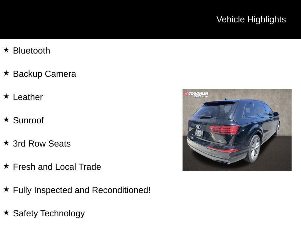 Adaptive Chassis Package (4-Wheel Steering and Comfort Adaptive Air Suspension), Audi MMI Navigation Plus Package (Audi Connect CARE, Audi Connect PRIME & PLUS, Audi MMI Navigation Plus w/MMI Touch, and Audi Smartphone Integration), Driver Assistance Package (Audi Active Lane Assist, Audi Adaptive Cruise Control w/Stop & Go, Audi Pre Sense Front, High-Beam Assistant, and Traffic Sign Recognition), Extended Leather Package, LED Interior Lighting Package, LED Interior Lighting Package Plus, Luxury Package (Alcantara Headliner, Individual Contour Front Seats, Power-Closing Doors, and Valcona Leather Seat Trim), Prestige Package (3D Bose Surround Sound System, Audi Advanced Key, Audi Side Assist, Electric Tilt/Telescopic Steering Column, Head-Up Display, Heated Auto-Dimming Power Folding Exterior Mirrors, Stainless Steel Trunk Sill, and Wheels: 20 10-Spoke-Star Design), Titanium-Black Optic Package (Titanium-Black Front Grille, Titanium-Black Roof Rails, Titanium-Black Window Surrounds, and Wheels: 21 Titanium 5-Twin-Spoke Design RS), Vision Package (Audi Virtual Cockpit, Full LED Headlights, and Top View Camera System), Warm Weather Package (4-Zone Automatic Climate Control, Driver & Passenger Front Seats w/Ventilation, and Manual Window Shades For Rear Doors & Tailgate), 10 Speakers, 3.204 Axle Ratio, 3rd row seats: bench, 4-Wheel Disc Brakes, ABS brakes, Air Conditioning, Alloy wheels, AM/FM radio: SiriusXM, Auto-dimming Rear-View mirror, Automatic temperature control, Black Alcantara Headliner, Brake assist, Bumpers: body-color, CD player, Compass, Delay-off headlights, DELETE Front License Plate Holder, Driver door bin, Driver vanity mirror, Driver's Seat Mounted Armrest, Dual front impact airbags, Dual front side impact airbags, Electronic Stability Control, Exterior Parking Camera Rear, Four wheel independent suspension, Front anti-roll bar, Front Bucket Seats, Front dual zone A/C, Front fog lights, Front reading lights, Fully automatic headlights, Garage door transmitter: HomeLink, Heated door mirrors, Heated Front Bucket Seats, Heated front seats, High Gloss Black/Gray Oak Inlays, High intensity discharge headlights: Xenon plus, Illuminated entry, Leather Seating Surfaces, Leather Shift Knob, Leather steering wheel, Low tire pressure warning, Memory seat, Night Vision Assistant, Occupant sensing airbag, Outside temperature display, Overhead airbag, Panic alarm, Passenger door bin, Passenger seat mounted armrest, Passenger vanity mirror, Power door mirrors, Power driver seat, Power Liftgate, Power moonroof, Power passenger seat, Power steering, Power windows, Privacy Trunk Cover, Radio data system, Radio: MMI Radio Plus w/Audi Sound System, Rain sensing wipers, Rear air conditioning, Rear anti-roll bar, Rear fog lights, Rear reading lights, Rear seat center armrest, Rear window defroster, Rear window wiper, Remote keyless entry, Roof rack: rails only, Security system, Speed control, Speed-sensing steering, Split folding rear seat, Spoiler, Steering wheel mounted audio controls, Tachometer, Telescoping steering wheel, Tilt steering wheel, Traction control, Trip computer, Turn signal indicator mirrors, Variably intermittent wipers, and Wheels: 19 5-V-Spoke Design.