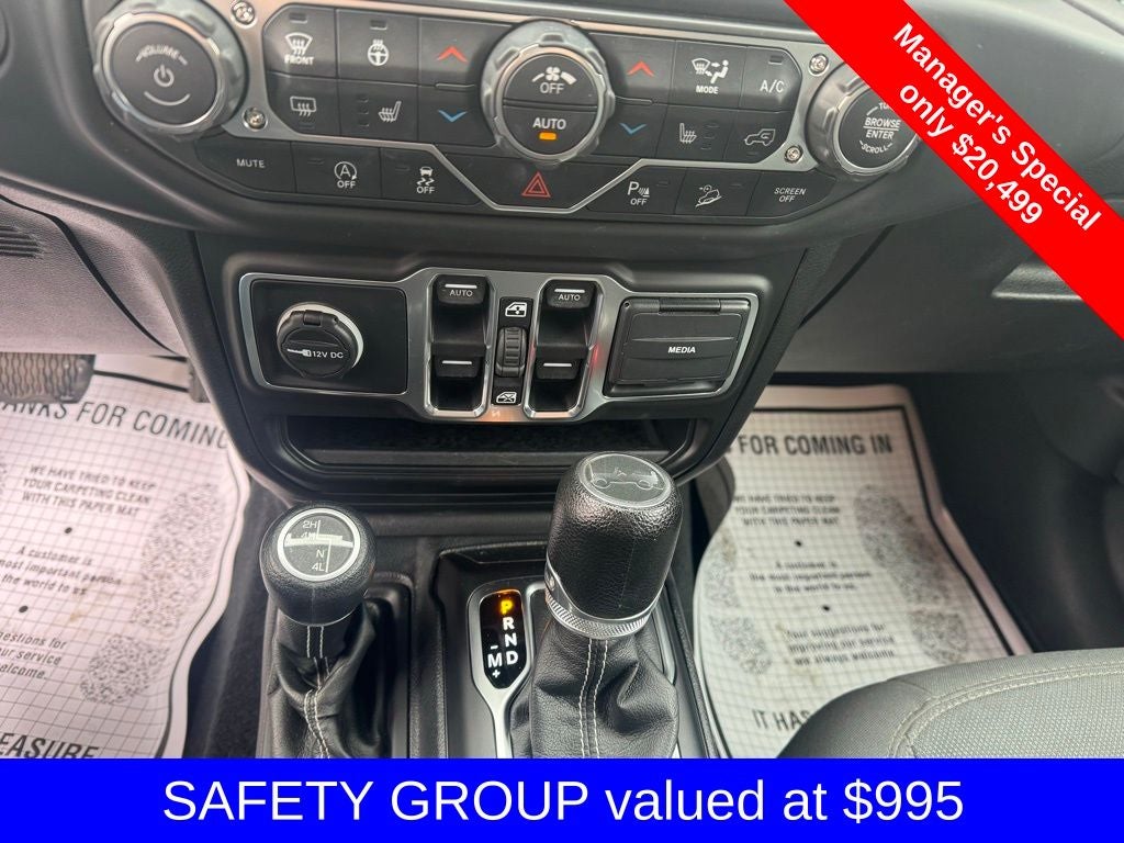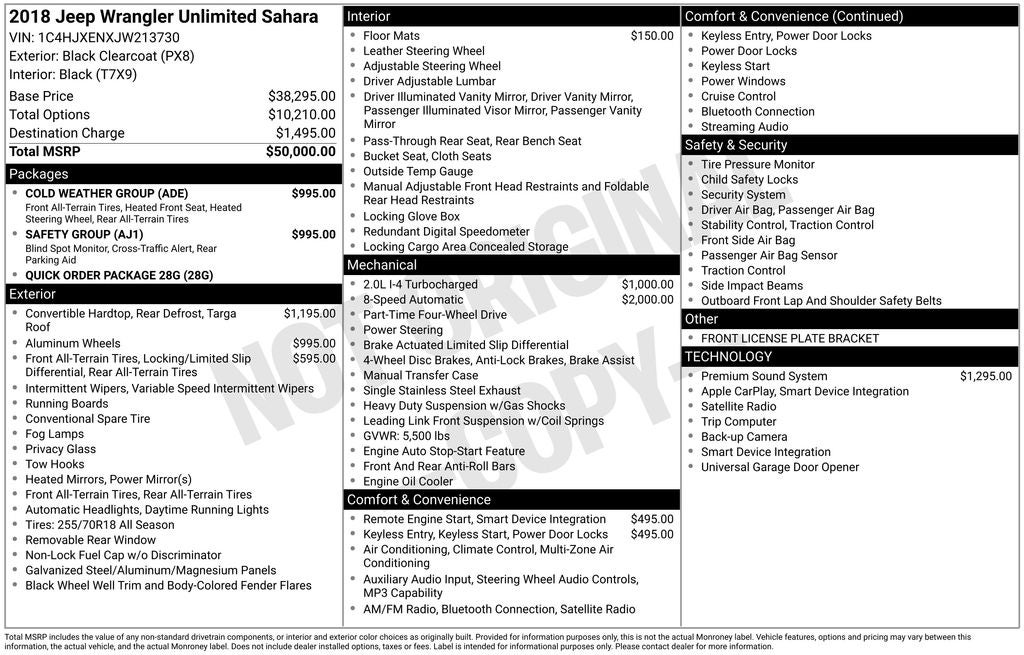 Equipped with Cold Weather Group (Heated Front Seats and Heated Steering Wheel), Quick Order Package 28G, Safety Group (Blind Spot & Cross Path Detection and ParkSense Rear Park Assist System), 1-Yr SiriusXM Radio Service, 3.45 Rear Axle Ratio, 4-Wheel Disc Brakes, 8 Speakers, ABS brakes, Air Conditioning, Alloy wheels, Alpine Premium Audio System, AM/FM radio: SiriusXM, Anti-Spin Differential Rear Axle, Apple CarPlay (DISC), Apple CarPlay/Android Auto, Automatic temperature control, Black 3-Piece Hard Top, Brake assist, Cloth Low-Back Bucket Seats, Compass, Delay-off headlights, Driver door bin, Driver vanity mirror, Dual front impact airbags, Dual front side impact airbags, Electronic Stability Control, For More Info, Call 800-643-2112, Freedom Panel Storage Bag, Front anti-roll bar, Front Bucket Seats, Front Center Armrest w/Storage, Front dual zone A/C, Front fog lights, Front License Plate Bracket (DISC), Front reading lights, Fully automatic headlights, Garage door transmitter, Heated door mirrors, Heavy Duty Suspension w/Gas Shocks, Illuminated entry, Integrated roll-over protection, Leather steering wheel, Low tire pressure warning, MOPAR All-Weather Floor Mats, Non-Lock Fuel Cap w/o Discriminator, Occupant sensing airbag, Outside temperature display, Panic alarm, ParkView Rear Back-Up Camera, Passenger door bin, Passenger vanity mirror, Power door mirrors, Power steering, Power windows, Radio data system, Radio: Uconnect 4 w/7 Display, Rear anti-roll bar, Rear reading lights, Rear Window Defroster, Rear Window Wiper/Washer, Remote keyless entry, Remote Proximity Keyless Entry, Remote Start System, Security system, SiriusXM Satellite Radio (DISC), Speed control, Split folding rear seat, Steering wheel mounted audio controls, Tachometer, Telescoping steering wheel, Tilt steering wheel, Traction control, Trip computer, Variably intermittent wipers, Voltmeter, Wheels: 18 x 7.5 Polished w/Gray Spokes, and Wheels: 18 x 7.5 Tech Gray Polished Face.
