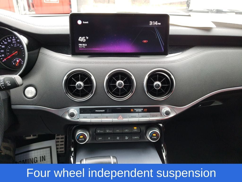 Ceramic Silver 2022 Kia Stinger GT1 AWD 8-Speed Automatic 3.3L V6 DGI Stinger GT1, 4D Sedan, 3.3L V6 DGI, 8-Speed Automatic, AWD, Ceramic Silver, Black Leather, 4-Wheel Disc Brakes, 9 Speakers, ABS brakes, Air Conditioning, Alloy wheels, AM/FM radio: SiriusXM, Anti-whiplash front head restraints, Apple CarPlay & Android Auto, Auto High-beam Headlights, Auto-dimming Rear-View mirror, Automatic temperature control, Brake assist, Bumpers: body-color, Delay-off headlights, Driver door bin, Driver vanity mirror, Dual front impact airbags, Dual front side impact airbags, Electronic Stability Control, Emergency communication system: UVO eServices, Exterior Parking Camera Rear, Four wheel independent suspension, Front anti-roll bar, Front Bucket Seats, Front Center Armrest, Front dual zone A/C, Front reading lights, Fully automatic headlights, harman/kardon® Speakers, Heated door mirrors, Heated Front Bucket Seats, Heated front seats, Heated steering wheel, Illuminated entry, Knee airbag, Leather Seat Trim, Low tire pressure warning, Navigation System, Occupant sensing airbag, Outside temperature display, Overhead airbag, Overhead console, Panic alarm, Passenger door bin, Passenger vanity mirror, Power door mirrors, Power driver seat, Power moonroof, Power passenger seat, Power steering, Power windows, Radio: AM/FM/HD Audio System, Rain sensing wipers, Rear air conditioning, Rear anti-roll bar, Rear reading lights, Rear seat center armrest, Rear window defroster, Red Interior Color Package, Red Leather Seat Trim, Remote keyless entry, Security system, Smart Key w/ Push Button and Remote Start, Speed control, Speed-sensing steering, Speed-Sensitive Wipers, Split folding rear seat, Sport steering wheel, Steering wheel mounted audio controls, Tachometer, Telescoping steering wheel, Tilt steering wheel, Traction control, Trip computer, Turn signal indicator mirrors, Variably intermittent wipers, Wheels: 8.0J x 19 Front/8.5J x 19 Rear Alloy.