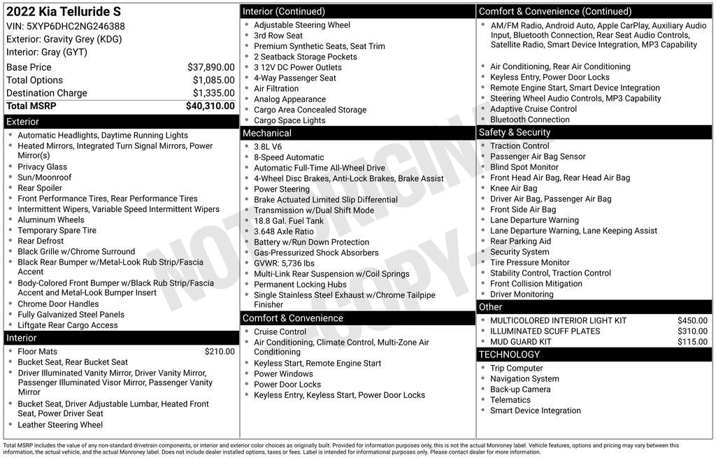 2022 Kia Telluride S in Gravity Gray with Artificial Leather. Clean CARFAX.