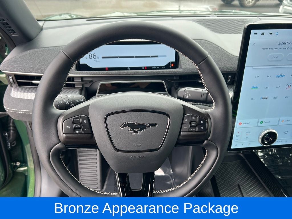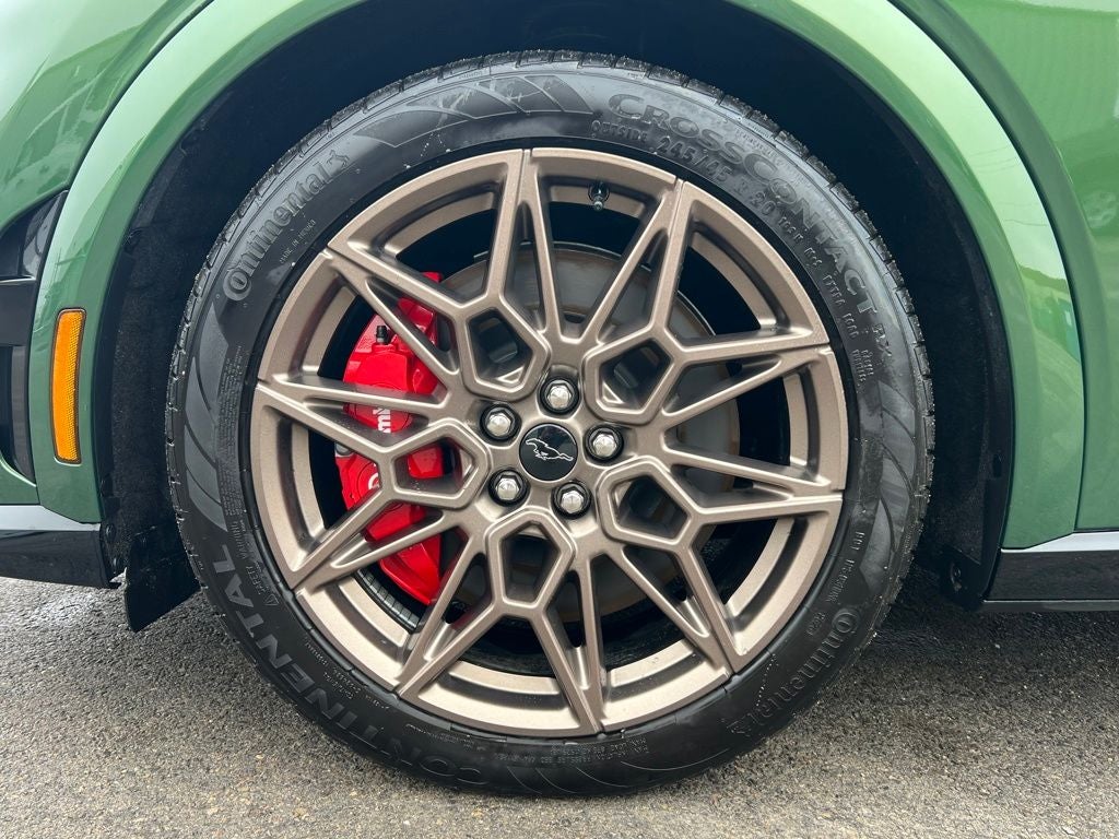 The Mustang Mach-E GT's stunning Eruption Green Metallic exterior is sure to turn heads wherever you go. Complementing the bold color is the Bronze Appearance Package, which includes 20-inch Sinister Bronze Painted wheels, a Bronze Mesh Front Grille Shield, and Mach-E 4X Door Badges & Rear GT Badge.